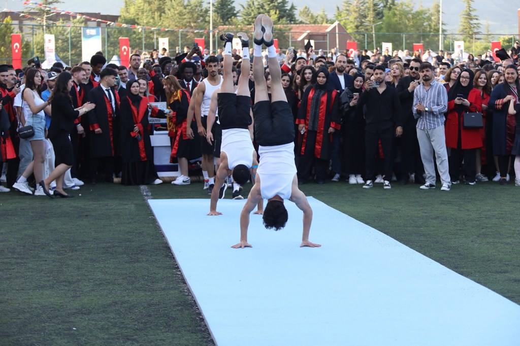 Tören, Spor Bilimleri Fakültesi öğrencilerinin sunduğu dans-jimnastik gösterisi, ailelerden gelen video mesajlarının paylaşımı ve “Parla” marşı eşliğinde bayrak-flama gösterisiyle renklendi.