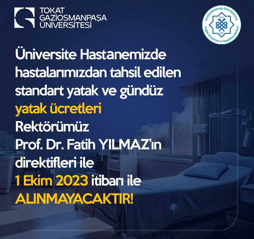 Rektörümüz Prof. Dr. Fatih YILMAZ yapmış olduğu açıklamada Üniversitemizin, araştırma geliştirme ile eğitim öğretim faaliyetlerinin yanı sıra topluma katkı anlamında da önemli faaliyetler gerçekleştirdiğini söyledi. Üniversite Hastanemiz tarafından Tokat ve bölgesine yüksek nitelikli sağlık hizmeti verildiğini ifade eden Rektörümüz, hastalar için çeşitli iyileştirmeler ve düzenlemelerin yapıldığını da belirtti. Bu kapsamda Üniversite Hastanemizde uygulanmakta olan standart yatak ücretinin artık alınmayacağını söyledi.