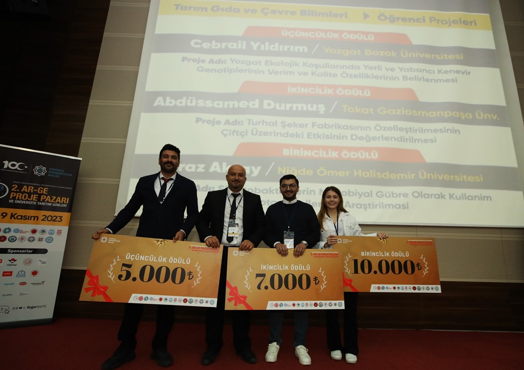 Tarım Gıda ve Çevre Bilimleri alanında öğrenci kategorisinde Birincilik ödülünü Niğde Ömer Halisdemir Üniversitesinden Iraz AKTAY, İkincilik ödülünü Üniversitemizden Abdüssamed DURMUŞ, Üçüncülük ödülünü ise Yozgat Bozok Üniversitesinden Cebrail YILDIRIM kazandı. Kazanan araştırmacıların ödüllerini TEKNOPARK Genel Müdürü Doç. Dr. Hakan POLATÇI takdim etti.