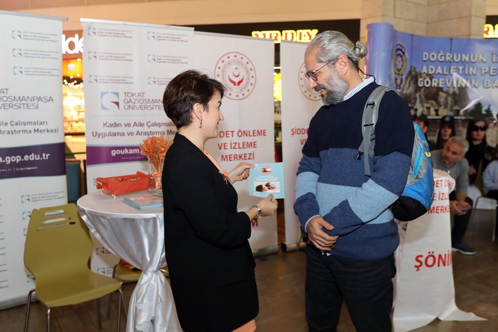 Üniversitemiz Kadın ve Aile Çalışmaları Araştırma ve Uygulama Merkezi, Aile ve Sosyal Politikalar İl Müdürlüğü, Jandarma İl Komutanlığı, Emniyet İl Müdürlüğü ve KADEM tarafından 25 Kasım Kadına Yönelik Şiddete Karşı Uluslararası Mücadele Günü kapsamında Tokat Novada AVM 3’üncü katta farkındalık standı ve etkinlikler düzenlendi. Etkinlikte Üniversitemiz Kadın ve Aile Çalışmaları Araştırma ve Uygulama Merkezi tarafından Kadın temalı Sulu Boya ve Nefes Atölyeleri gerçekleştirildi. Stantları, Aile ve Sosyal Hizmetler İl Müdürü Mahmut ÖZDEMİR, birimlerden temsilciler ve ziyaretçiler gezerek bilgilendirildi. Üniversitemiz Kadın ve Aile Çalışmaları Araştırma ve Uygulama Merkezi Müdürümüz Dr. Öğr. Gör. Zeynep ACUNGİL, “25 Kasım Kadına Yönelik Şiddete Karşı Uluslararası Mücadele Günü kapsamında merkezimiz olarak standımızı açtık. Standımızı ziyarete gelen vatandaşları bilgilendiriyoruz. Ayrıca Merkezimiz Müdür Yardımcısı Dr. Öğr. Gör. Vasfiye EROĞLU tarafından Nefes Atölyesi etkinliği ve Kadın temalı sulu boya etkinliği de gerçekleştiriyoruz” ifadelerini kullandı.