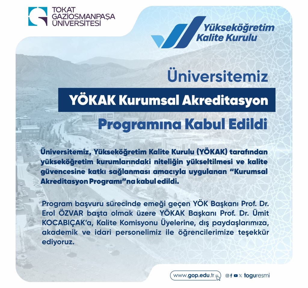 Üniversitemiz, Yükseköğretim Kalite Kurulu (YÖKAK) tarafından yükseköğretim kurumlarındaki niteliğin yükseltilmesi ve kalite güvencesine katkı sağlanması amacıyla uygulanan “Kurumsal Akreditasyon Programı”na kabul edildi.