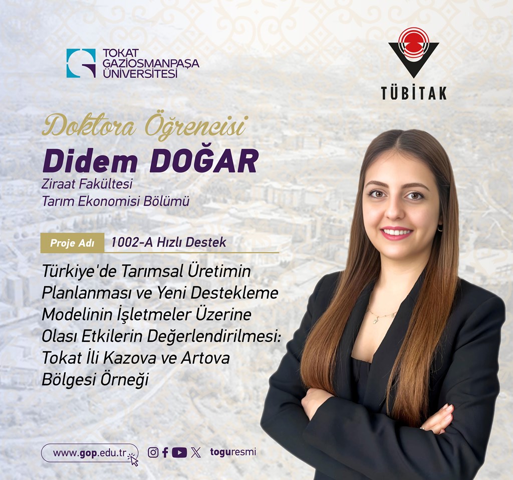 TÜBİTAK- 1002 Hızlı Destek Programı kapsamında projesi desteklenen Ziraat Fakültesi doktora öğrencimiz Didem Doğar'ı kutlarız.