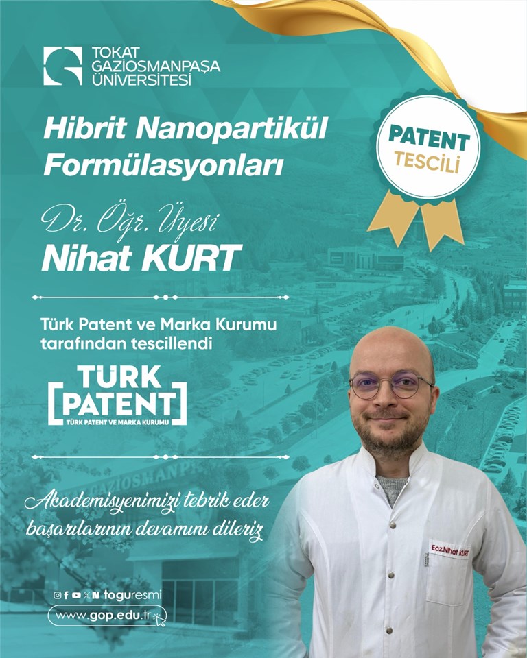 TOGÜ Eczacılık Fakültesi öğretim üyelerimizden Dr. Öğr. Üyesi Nihat KURT’un, Hacettepe ve Koç Üniversiteleri iş birliğiyle geliştirdiği "Hibrit Nanopartikül Formülasyonları" Türk Patent ve Marka Kurumu tarafından tescil edildi. Değerli hocamızı ve çalışma arkadaşlarını tebrik eder, başarılarının devamını dileriz.